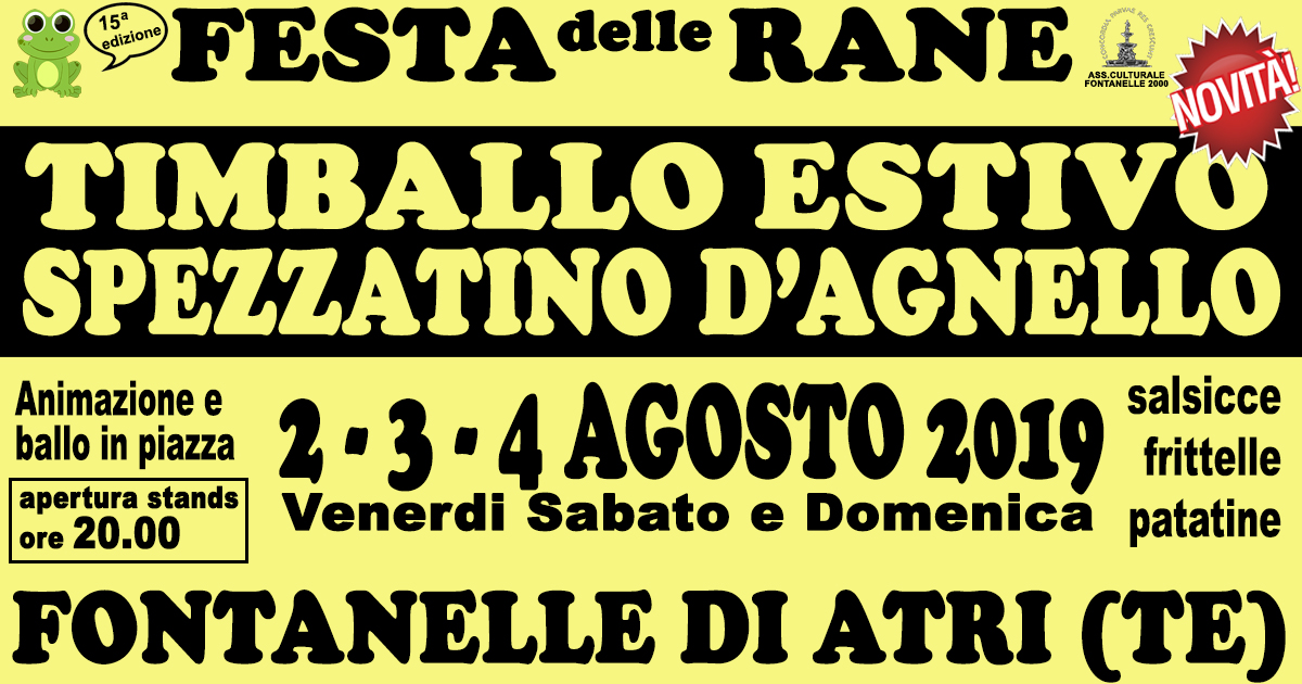 Il primo week-end di agosto – da venerdì 2 a domenica 4 – avrà luogo a Fontanelle di Atri (TE), come ogni anno, la tradizionale festa delle rane, che si svolgerà all’insegna del buon cibo tradizionale e del divertimento.