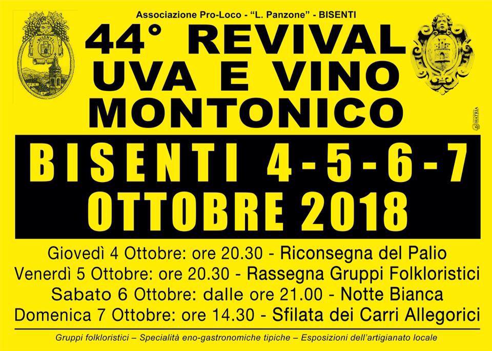 Dal 4 al 7 ottobre 2018 si svolgerà il 44esimo “Revival Uva e Vino Montonico”: a Bisenti è tutto pronto per questo appuntamento tradizionale e attesissimo dedicato alla celebrazione della bontà del vino locale