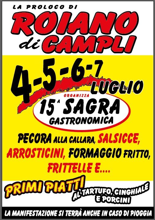 La “Sagra enogastronomica” è organizzata dalla Pro Loco di Roiano di Campli e il suo svolgimento sarà garantito anche in caso di condizioni meteo avverse. Per avere ulteriori info sul programma di questa manifestazione è possibile seguire la Pagina Facebook della Pro Loco e la Pagina Facebook dedicata all’evento