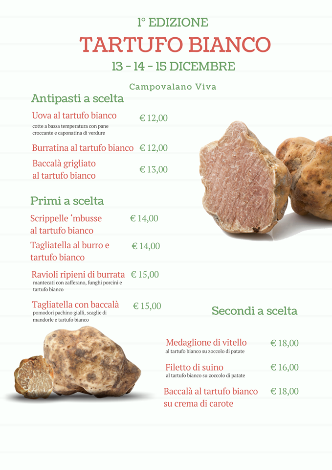 tartufo bianco Campovalano menuFiore all’occhiello di queste giornate è il tartufo bianco declinato in varie interpretazioni gastronomiche.