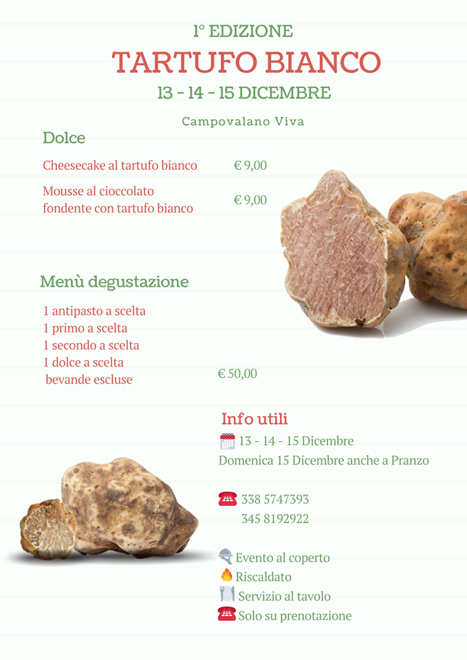 Il tartufo bianco a Campovalano: un evento che si svolgerà per la prima volta il 13, il 14 e il 15 dicembre 2019 e che sarà tutto dedicato a questo pregiatissimo prodotto locale proposto in un menu davvero irresistibile.