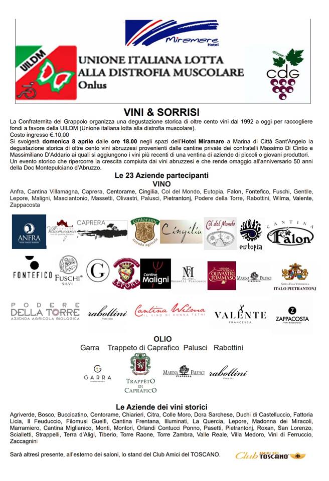 Per domenica 8 aprile la Confraternita propone l’appuntamento con “Vini&Sorrisi”. E’ un evento che si svolgerà presso l’Hotel Miramare di Marina di Città Sant’Angelo e che, oltre ad avere uno scopo benefico, si lega anche all’anniversario dei 50 anni dal conferimento della DOC al Montepulciano d’Abruzzo.