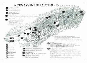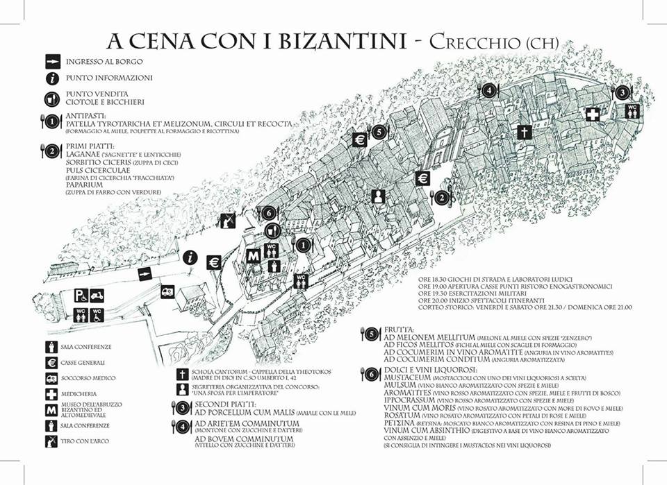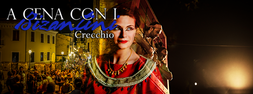 ‘A Cena con i Bizantini’ è una manifestazione che abbina un percorso di natura gastronomica a uno di fattura culturale, proponendosi di raccontare le vicende accadute durante la battaglia di Aternum, in cui il Comes Vitaliano libera la popolazione dalla minaccia longobarda, festeggiando con banchetti e cortei. Il momento più importante dell’evento è, senza dubbio, il corteo storico, che ricorda la vittoria dei Bizantini sui nemici longobardi, nel 596 d.C., gli stessi che avevano brutalmente ucciso il vescovo Cetteo, facendolo affogare nel fiume e che erano riusciti a conquistare gli accampamenti nella zona vicino Pescara, al tempo chiamata Aternum. A seguito di questa infamante offesa, il Comes Vitaliano, insieme al suo esercito bizantino, decise di combattere gli aggressori, vincendoli e mettendoli in fuga. L’impresa fu talmente eroica che Vassilissa, principessa di origini egiziane e governatrice della cittadina di Crecchio, organizzò quella che all’epoca era considerata la parata celebrativa più rilevante per i vincitori, dal momento che vi partecipava tutta la popolazione: il Trionfo. Di questa antica usanza, vengono ricordati e messi in scena tre rilevanti situazioni, cioè quella del discorso verso i soldati, i premi per i più meritevoli e il giuramento dei novizi e la preghiera in cui si ringrazia per il trionfo.