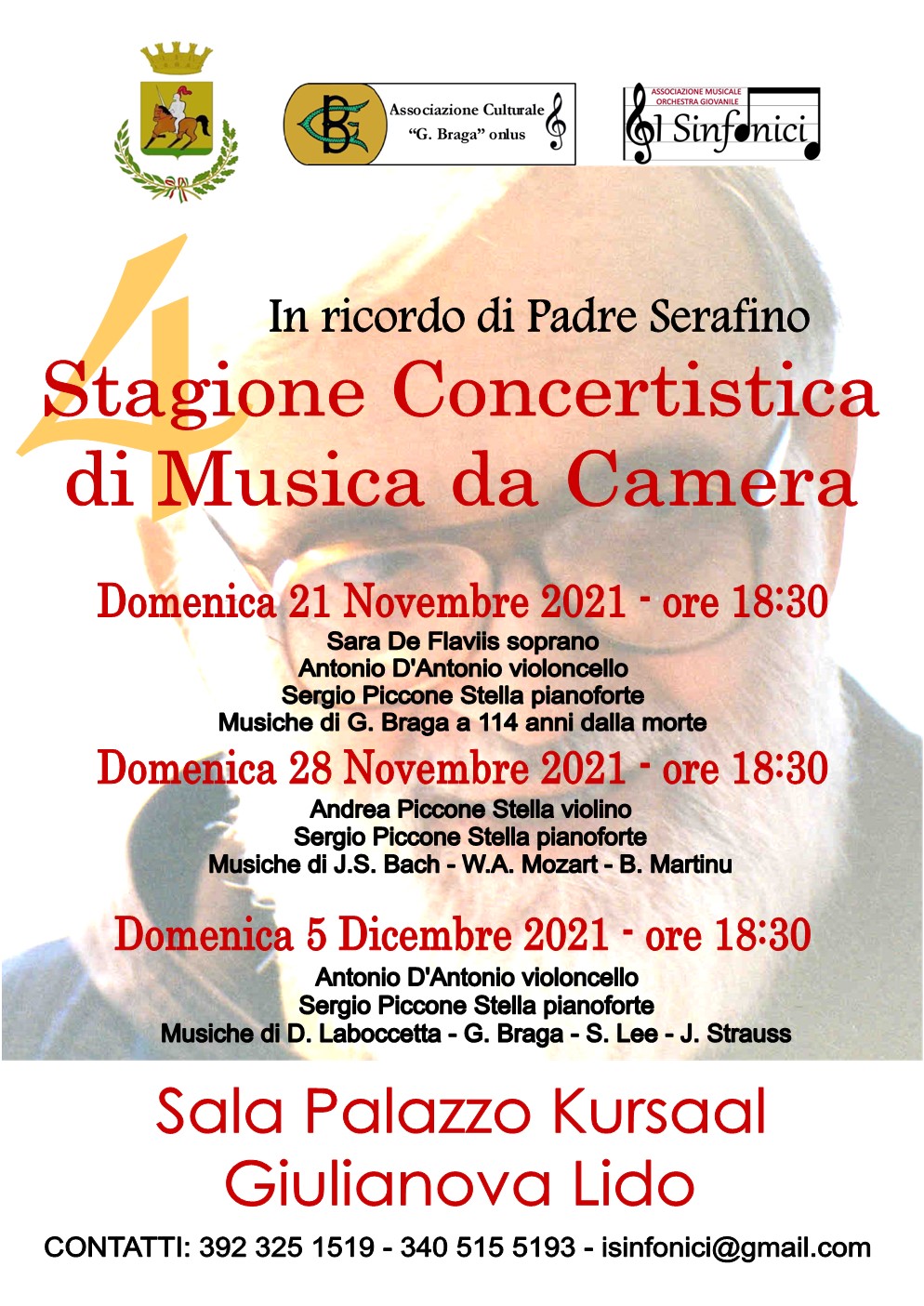Organizzato in ricordo di Padre Serafino, questo evento è a cura delle associazioni I Sinfonici e Gaetano Braga. I tre appuntamenti sono stati fissati per domenica 21 novembre, domenica 28 novembre e domenica 5 dicembre. La location dei concerti sarà presso la sala di Palazzo Kursaal a Giulianova Lido.