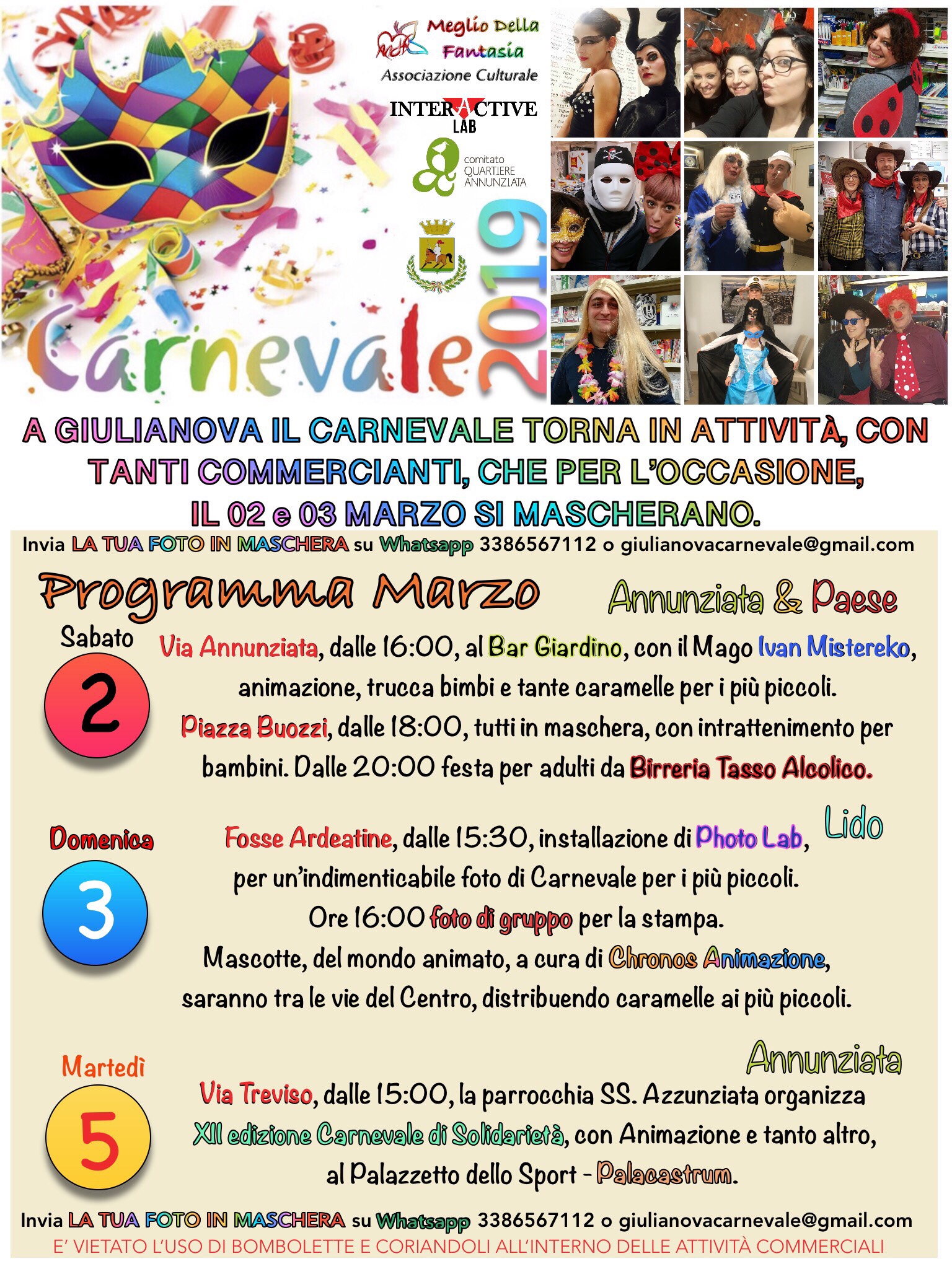 Il Carnevale 2019 a Giulianova è in dirittura di arrivo con un programma ricco di appuntamenti per il 2, il 3 e il 5 marzo e che sarà dedicato al divertimento di grandi e piccoli: la parola d’ordine di queste giornate sarà “tutti in maschera!”
