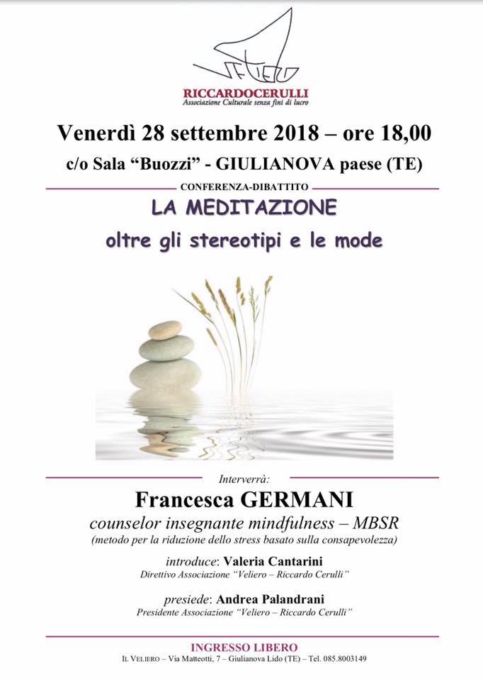 L’Associazione Culturale “VELIERO Riccardo Cerulli” ha organizzato per venerdì 28 settembre 2018 questo interessante incontro dal titolo: “La meditazione oltre gli stereotipi e le mode”.