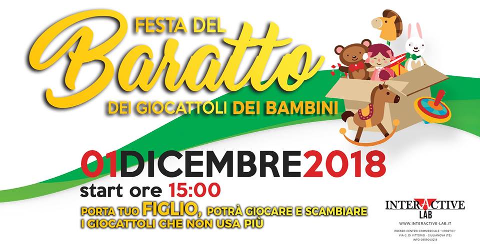 La “Festa del baratto dei giocattoli dei bambini” si svolgerà a Giulianova sabato 1 dicembre 2018: appuntamento presso il Centro Commerciale “I Portici” per una giornata all’insegna dello scambio, del divertimento e dell’amicizia