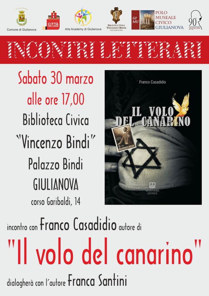 Franco Casadidio sarà protagonista del prossimo appuntamento degli “Incontri letterari” a Giulianova: sabato 30 marzo 2019, alle ore 17.00, presenterà il suo ultimo romanzo “Il volo del canarino”
