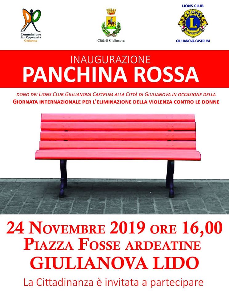 Alle ore 16.00, in Piazza delle Fosse Ardeatine, ci sarà l’inaugurazione della Panchina Rossa. Si tratta di un’opera artistica realizzata da un artista giuliese che è stata donata al Comune dal Lions Club Giulianova Castrum.