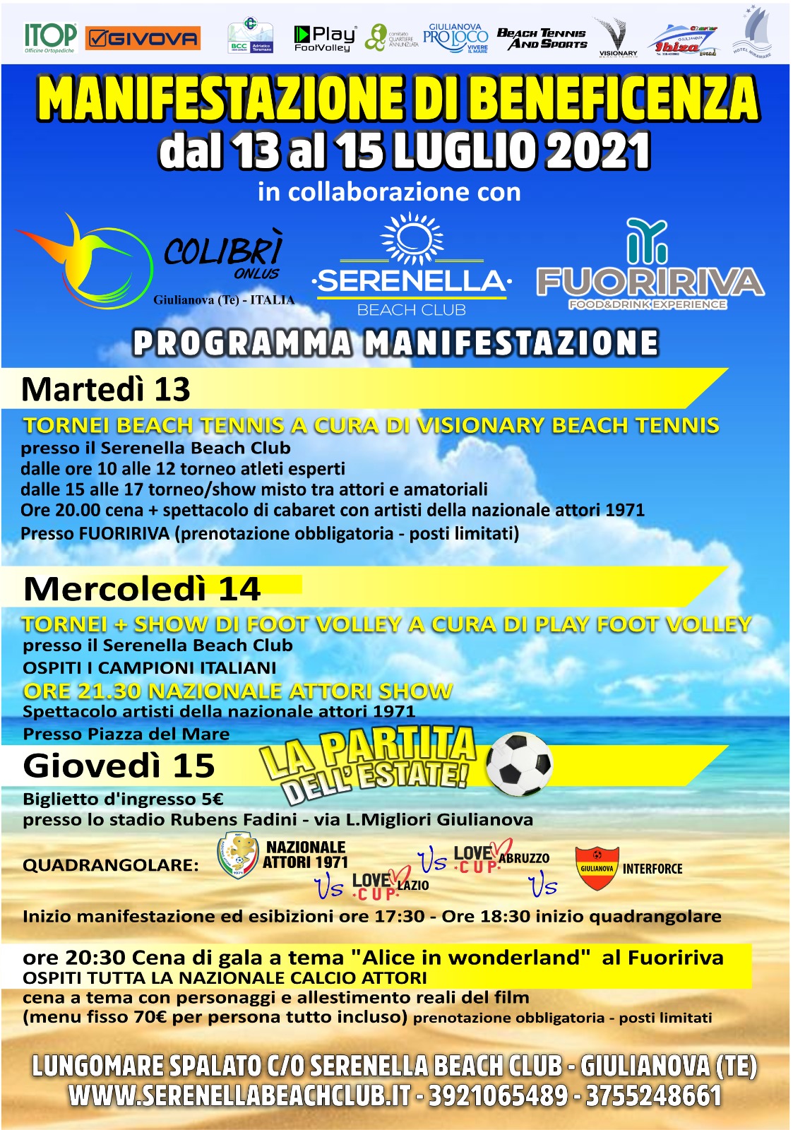 Il Serenella Beach Club e il ristorante Fuoririva hanno organizzato una manifestazione di beneficienza che vedrà protagonista la Nazionale Attori 1971. Si svolgerà dal 13 al 15 luglio e nel programma di questo evento sono previsti diversi appuntamenti, tra cui la partita dell’estate.