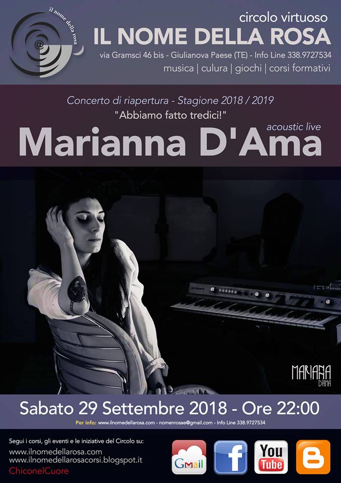 La splendida voce di Marianna D’ama sarà assoluta protagonista della serata di sabato 29 settembre 2018 organizzata dal Circolo Virtuoso “Il Nome della Rosa” di Giulianova in occasione dell’inizio del suo tredicesimo anno di attività