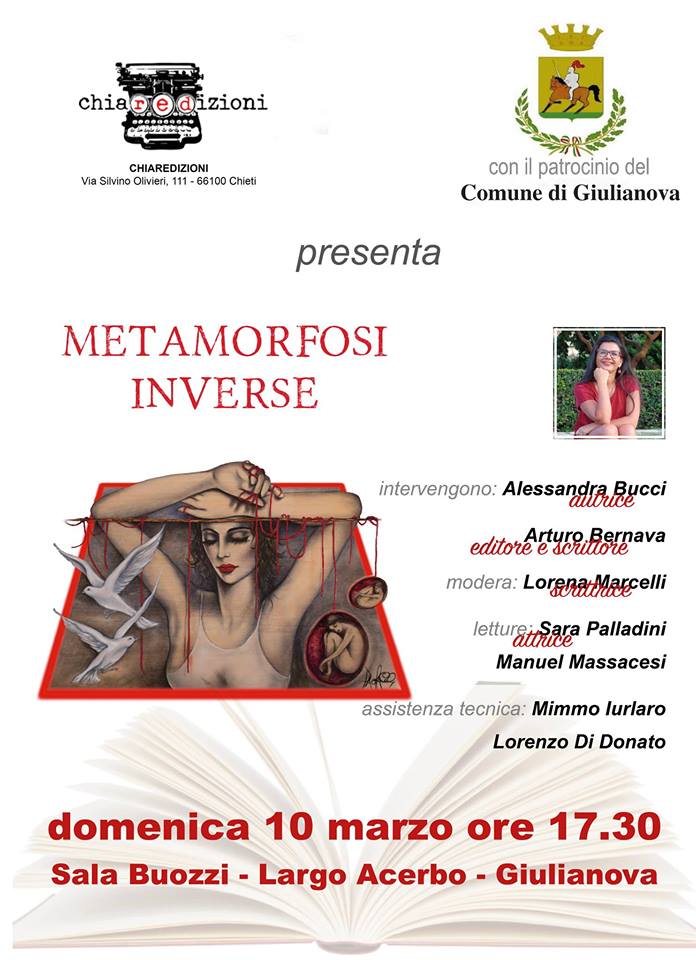 “Metamorfosi inverse” è il titolo del nuovo libro pubblicato da Alessandra Bucci che sarà presentato a Giulianova domenica 10 marzo 2019: l’evento si svolgerà nella Sala Comunale “Bozzi” alla presenza dell’autrice
