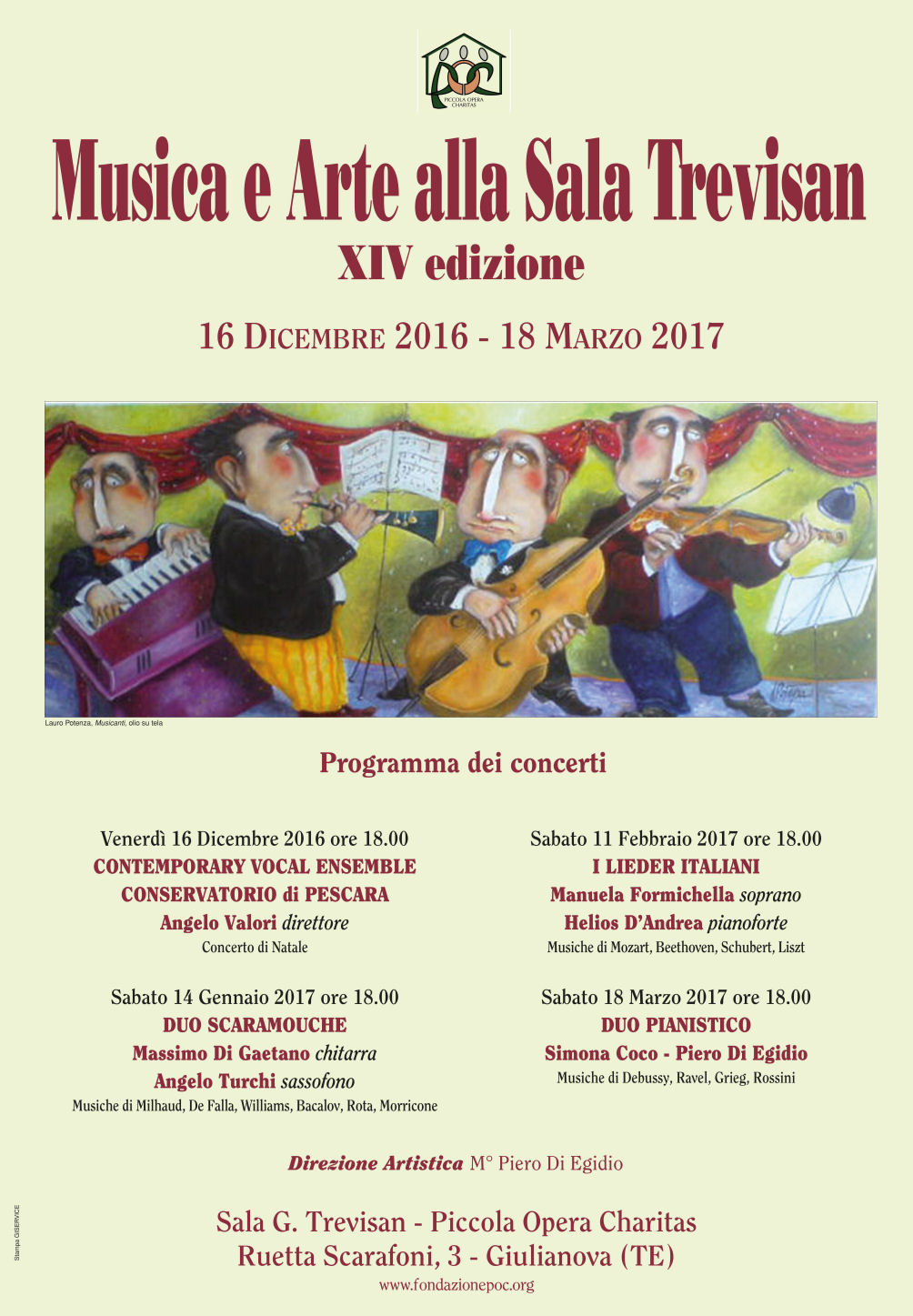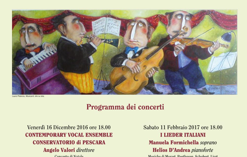 L’espressione creativa dell’arte e quella della musica trovano un felice connubio in questa manifestazione molto seguita e apprezzata che quest’anno avrà inizio venerdì 16 dicembre per poi proseguire con altri tre appuntamenti previsti per il 2017 nel mese di gennaio con il Duo Scaramouche, di febbraio con “I Lieder Italiani” e di marzo con il Duo pianistico Coco-Di Egidio.
