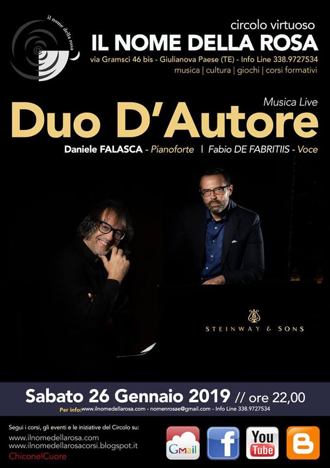 La musica di qualità torna ancora protagonista al Circolo Virtuoso “Il nome della Rosa” di Giulianova: il prossimo appuntamento è per sabato 26 gennaio con Daniele Falasca e Fabio De Fabritiis e il loro raffinato repertorio