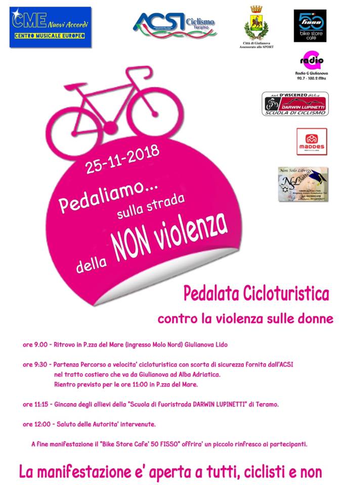 La pedalata cicloturistica dedicata alla lotta contro il femminicidio, argomento di dolorosa attualità, si svolgerà il 25 novembre 2018, Giornata Mondiale contro la Violenza sulle Donne, con un percorso che da Giulianova arriverà a Alba Adriatica