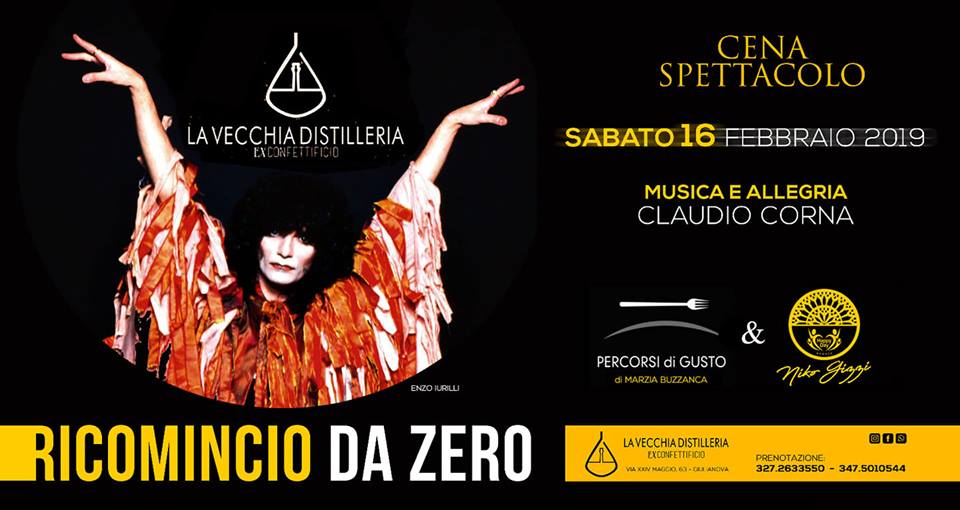 “Ricomincio da Zero” è l’evento che si svolgerà sabato 16 febbraio 2019 presso la Vecchia Distilleria (ex Confettificio) di Giulianova: appuntamento con uno spettacolo e una cena davvero da non perdere per tutti i fan di Renato Zero e per tutti quelli che amano la cucina di alta qualità