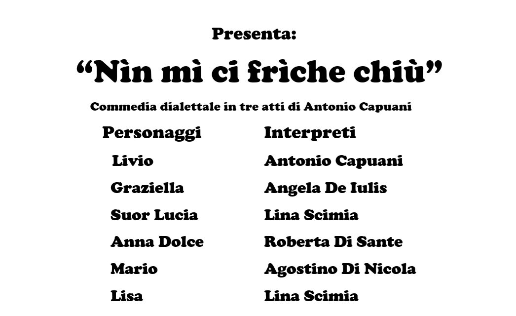 In corrispondenza dei festeggiamenti in programma per la ricorrenza della Santissima Madonna dell’Annunziata, venerdì 3 settembre andrà in scena lo spettacolo dialettale “Non mi friche chiu” della compagnia teatrale Il Carrozzone.