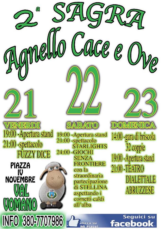 La 2° “Sagra dell’agnello cace e ove” avrà inizio venerdì 21 giugno con l’apertura degli stand alle ore 19.00, mentre alle ore 21.30 si esibiranno i “Fuzzy Dice” con il loro frizzantissimo repertorio di genere R&R.