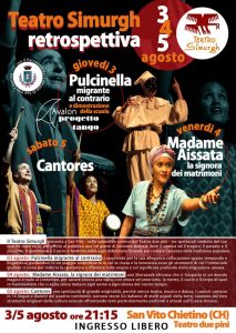 Si terranno il 3, 4 e 5 Agosto alle ore 21 e 30 presso il Teatro due pini a San Vito Chietino, tre serate dedicate agli spettacoli del Teatro Simurgh.