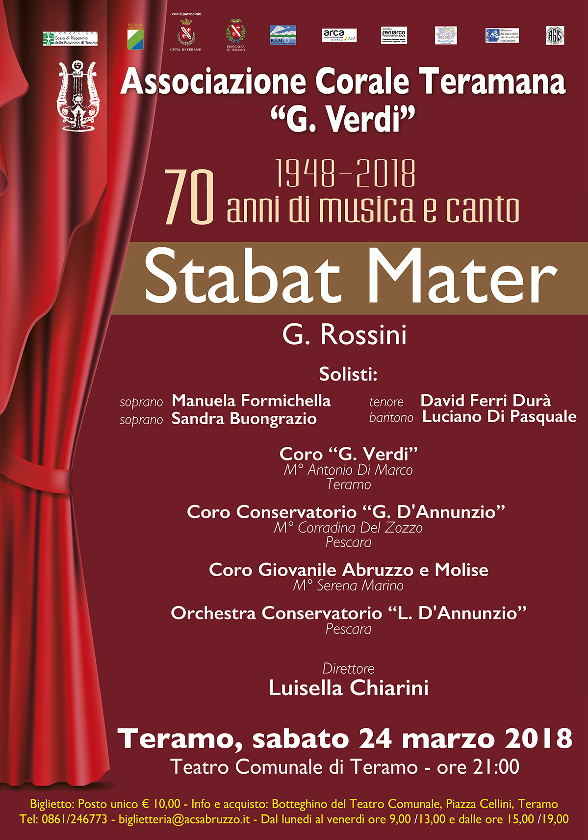 Il secondo appuntamento è fissato per il 24 marzo presso il Teatro Comunale di Teramo dove, a partire dalle ore 21.00, sarà rappresentata la “Stabat Mater” di Rossini.