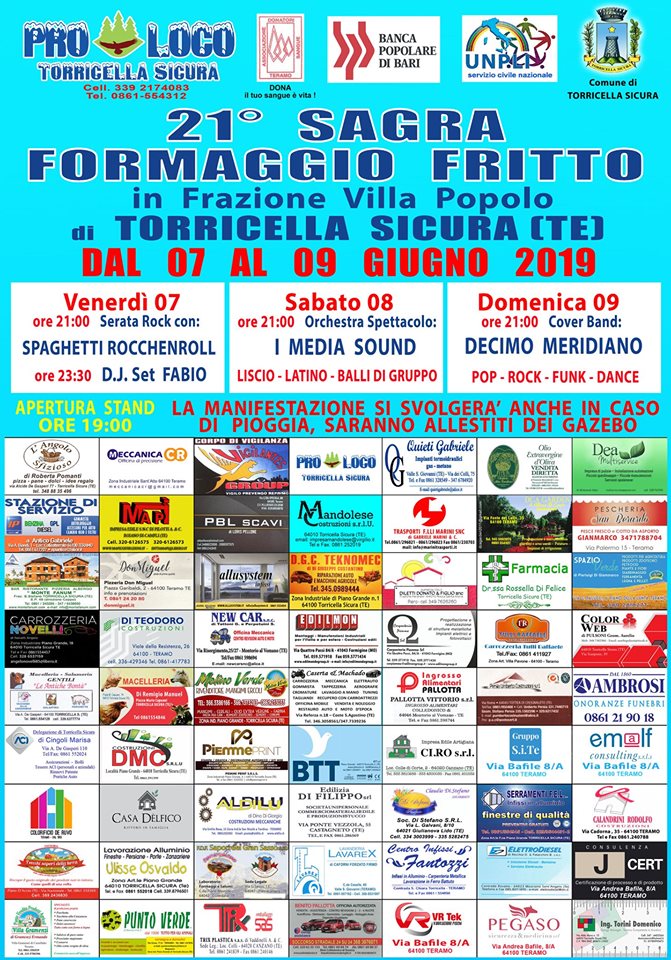 La “Sagra del formaggio fritto” torna con la sua 21esima edizione: l’appuntamento è a Villa Popolo di Torricella Sicura dal 7 al 9 giugno 2019 con tante golosità della tradizione e musica per tutti i gusti