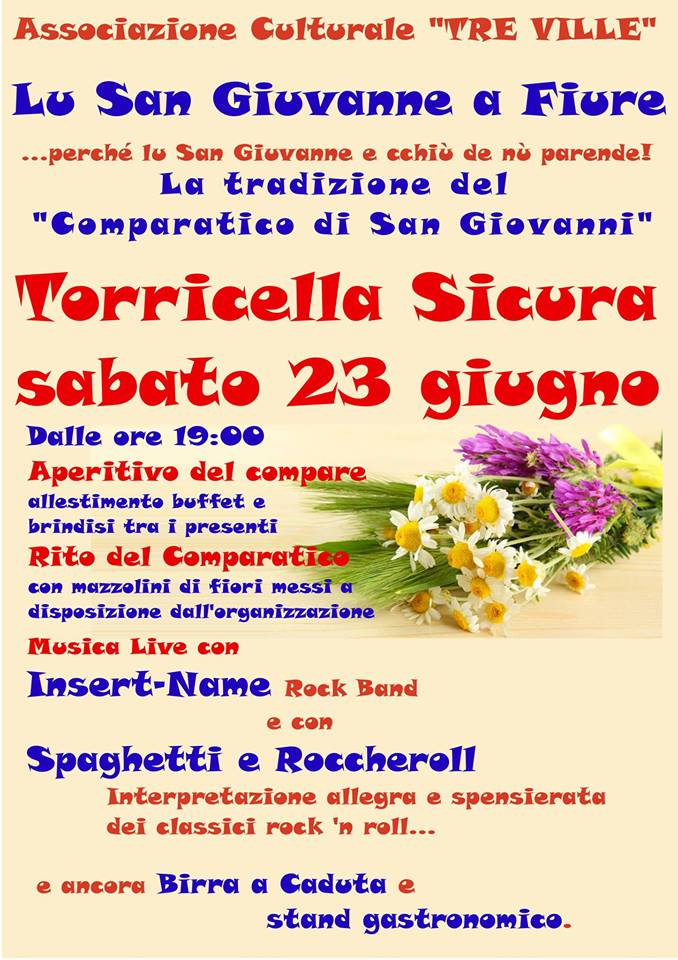 Come ogni anno la festa di San Giovanni Battista in Abruzzo diventa un appuntamento che permette di fare un vero e proprio tuffo nella più antica tradizione locale. Per questo è da non perdere l’evento, organizzato dall’Associazione Culturale “Tre Ville”, che si svolgerà a Torricella Sicura sabato 23 giugno, a partire dalle ore 19.00.