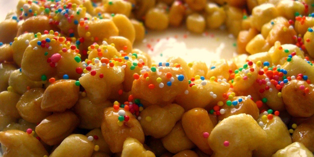 Preparate una fontana con la farina e mettete al centro sei uova intere. Delle rimanenti utilizzerete solo l’albume montato a neve. Aggiungete lo zucchero, l’anice e le mandorle e impastate il composto fino ad ottenere un impasto piuttosto omogeneo: a questo punto unite gli albumi montati a neve e continuate ad impastare. Quando l’impasto è pronto, tagliate la pasta a listarelle, poi in parti più piccole dalle quali formerete delle palline grandi più o meno come un’oliva. Friggete le palline, posizionatele su un ampio vassoio coperto con carta da forno, versate sopra le palline il miele e guarnite con diavoletti (palline o bastoncini) di zucchero colorati.